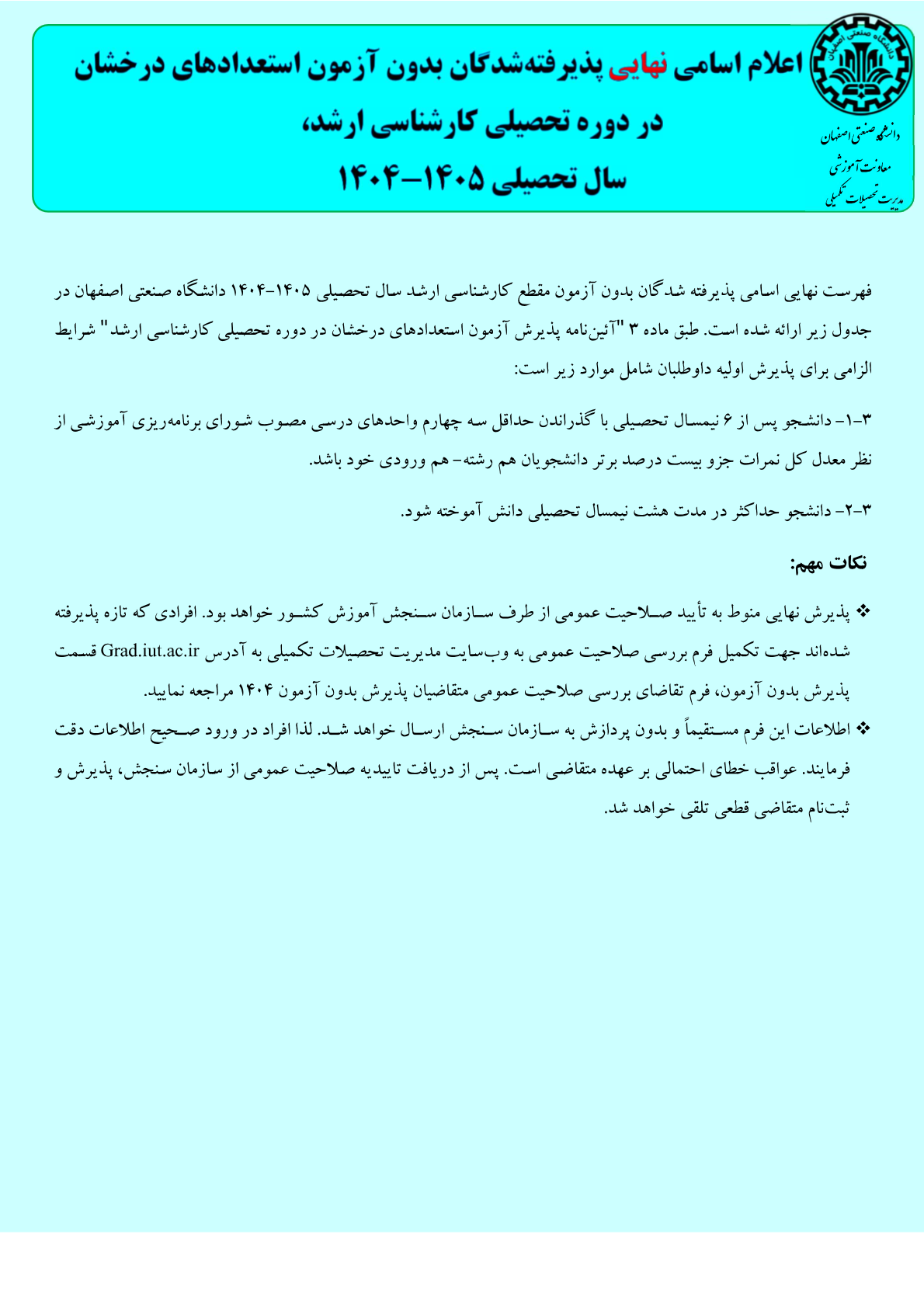 اعلام اسامی نهایی پذیرفته شدگان بدون آزمون- استعدادهای درخشان - دانشگاه صنعتی اصفهان 1404
