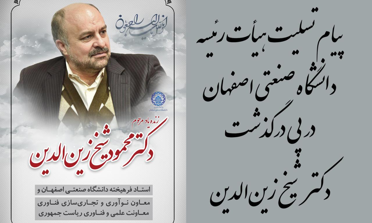 هيأت رئيسه دانشگاه صنعتي اصفهان اين فقدان بزرگ را به خانواده داغدار ایشان بویژه همکار محترم سركار خانم دكتر سليمانيان زاد، استاد ارجمند دانشكده كشاورزي دانشگاه صنعتي اصفهان، فرزندان، برادران و خواهران ايشان و نيز همكاران محترم دانشگاه صنعتي اصفهان، شهرك علمي و تحقيقاتي اصفهان، معاونت علمي و فناوري رياست جمهوري و جامعه علم و فناوری کشور تسليت عرض نموده و از خداوند منان، علو درجات آن عزیز را طلب می نماید.