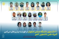 برایناساس مهدی قنبری با کسب رتبه ۵ رشته مهندسی صنایع، علی قاسمی با کسب رتبه ۶ رشته مهندسی عمران، امیرحسین ارشدی کلمه با کسب رتبه ۸ و محمدرضا پور پیرعلی با کسب رتبه ۹ رشته فیزیک، فاطمه نقیزاده با کسب رتبه ۷ رشته مهندسی تولید و ژنتیک گیاهی، سید عارف موسوی با کسب رتبه ۷ و عرفان گرامیزاده نائینی با کسب رتبه ۸ رشته مهندسی کامپیوتر، دانشجویان برگزیده دانشگاه صنعتی اصفهان با رتبههای تکرقمی سیامین المپیاد علمی دانشجویی کشور معرفی شدند.