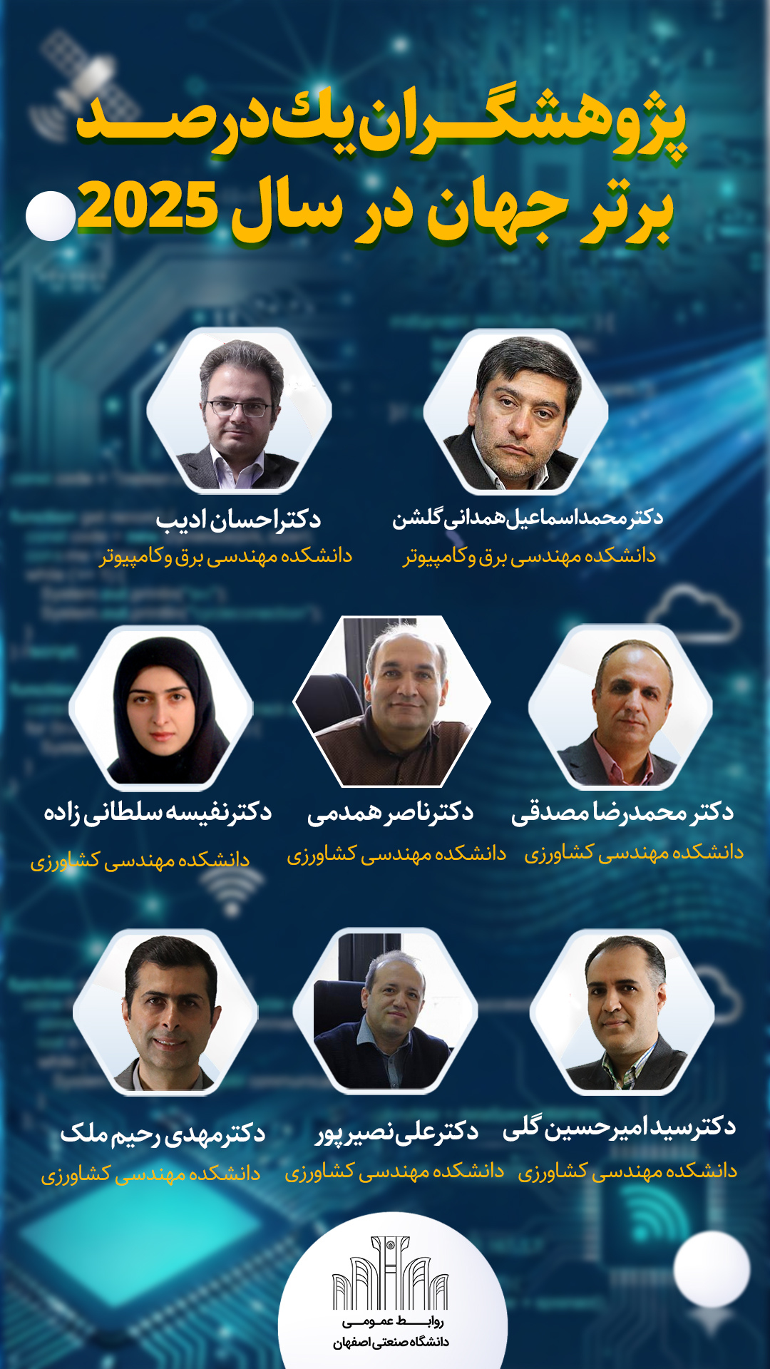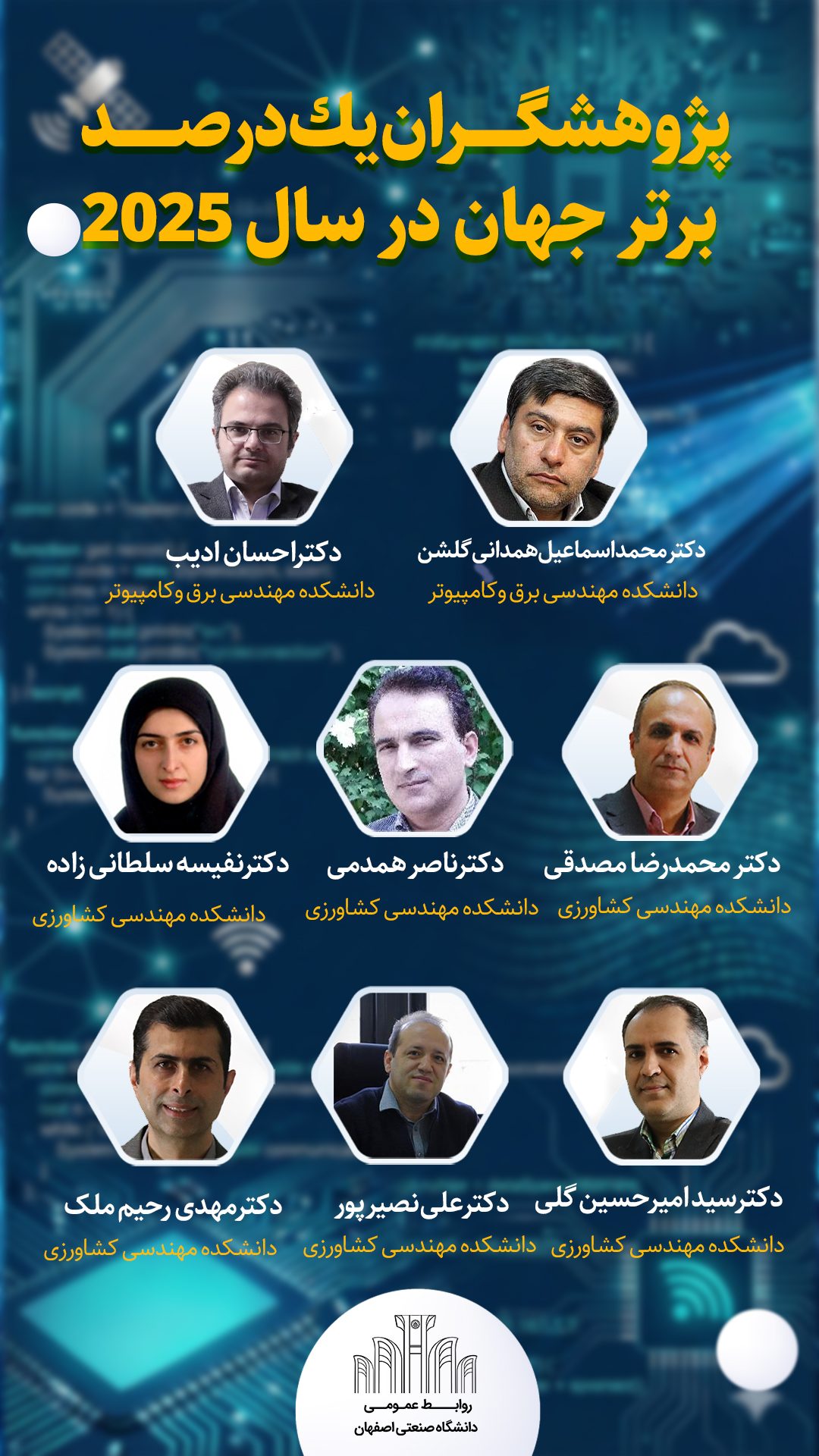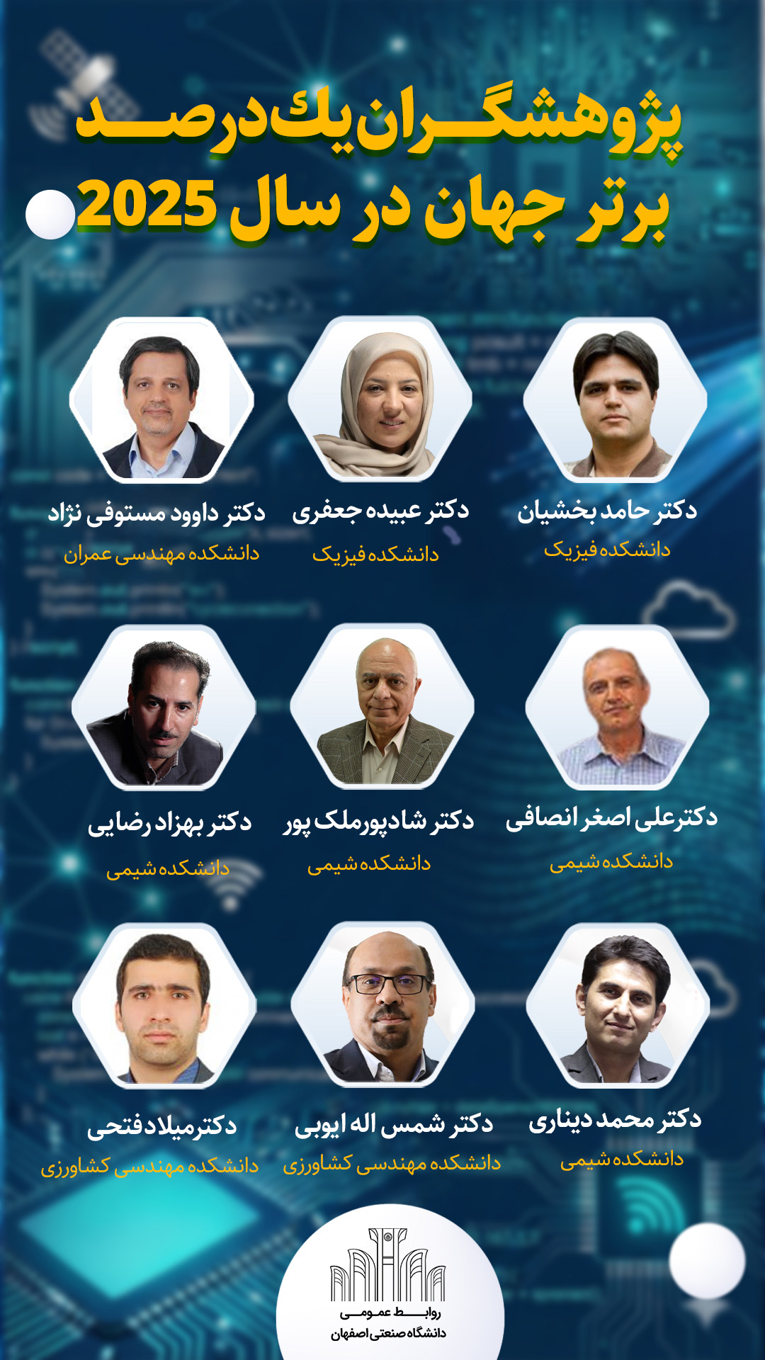 دکتر محمد اسماعیل همدانی گلشن و دکتراحسان ادیب ازاعضای هیأت علمی دانشکده مهندسی برق وکامپیوتر، در حوزه موضوعی مهندسی، دکتر داوود مستوفی نژاد عضو هیأت علمی دانشکده مهندسی عمران در حوزه موضوعی علم مواد-مهندسی و دکتر مسعود دودانگه، دانش آموخته شیمی دانشگاه صنعتی اصفهان در حوزه موضوعی پزشکی بالینی، دیگر پژوهشگران يك درصد برتر جهان دانشگاه صنعتی اصفهان در سال 2025 هستند.