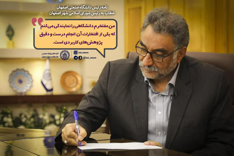 احتراماً به استحضار می رساند یکی از اهداف برنامه تحول راهبردی دانشگاه صنعتي اصفهان، آن است که تأثیر گذارترین دانشگاه کشور در منطقه پیرامون خود باشد. انجام پروژههای پژوهشی نه برای کسب در آمد بلکه برای حل مسائل جامعه و صنعت و نقش آفرینی در توسعه این مرز و بوم است. در این جهت وقتی موضوعات شهری و حفظ سلامت و آسایش شهروندان مطرح میشود مسئولیت دانشگاه دو چندان میگردد. من مفتخرم دانشگاهی را نمایندگی میکنم که یکی از افتخارات آن انجام درست و دقیق پژوهشهای کاربردی است و تمامی آن چه به عنوان هزینههای انجام پروژه دریافت میدارد صرف انجام پژوهش و توسعه دانش فنی میگردد. هدفمند کردن پایان نامهها، توسعه آزمایشگاههای تحقیقاتی، ارتباط مناسب استاد و دانشجو و دانشجو پروری از دستاوردهای مهم ارتباط با صنعت است.