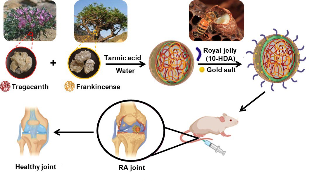 دانش آموخته دانشگاه صنعتی اصفهان تصریح کرد: در این پژوهش، نوع جدیدی از نانوحاملهای هسته-پوسته بر پایه هیدروژل صمغ های طبیعی کندر و کتیرا که در طب سنتی برای کاهش التهاب به کار میروند و شبکهای از پلی فنول و نانوذرات طلا که پایه ساخت داروهای سنتزی در درمان بسیاری از بیماریها هستند، به همراه ماده موثره ژل رویال زنبور عسل با ویژگیهای ثابت شده در تنظیم سیستم ایمنی در این نانوکامپوزیت بارگذاری شد.